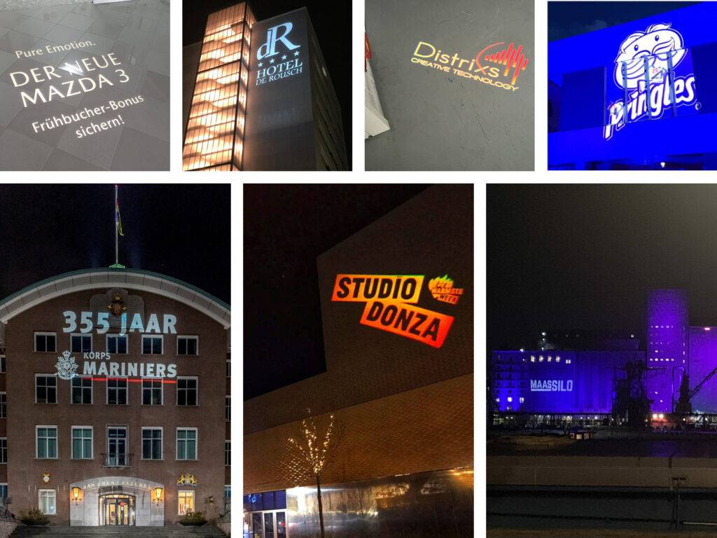 Door gebruik te maken van een waterdichte goboprojector kan het logo of een boodschap metersgroot op de gevel worden geprojecteerd.