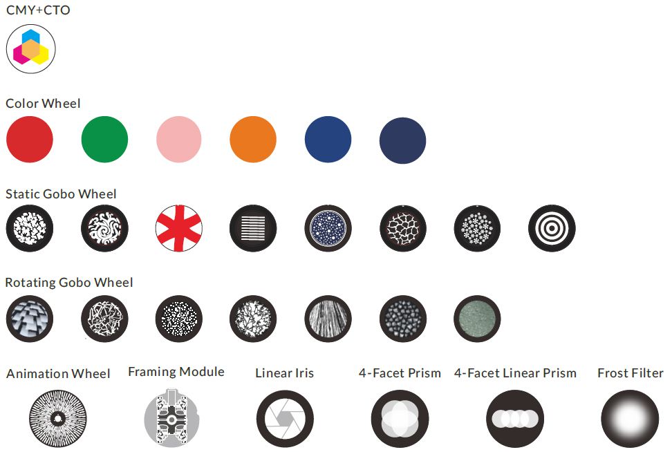 Linear CMY color mixing system provides rich color saturation and clear seamless color transition. The flow speed can be changed by adjusting the speed of the animation wheel, to create outstanding water and flame effect. All gobo wheels are made of high-definition color separation glass, they complement each other and create various graphics together with animation wheel. The color temperature of the AECO 10 is between 5,600k and 6,400k.