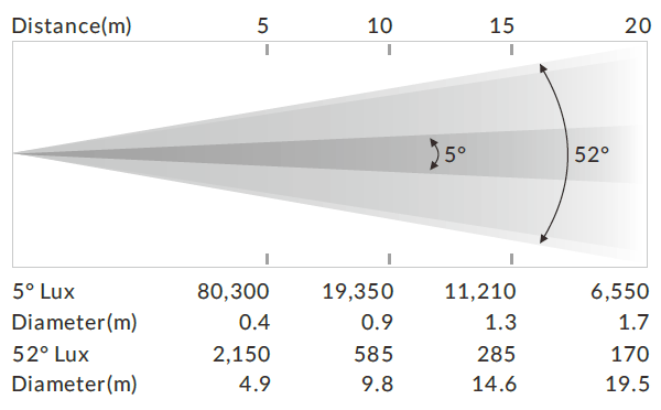 At 5° angle & 10 meters distance, output achieves 19,350 lux