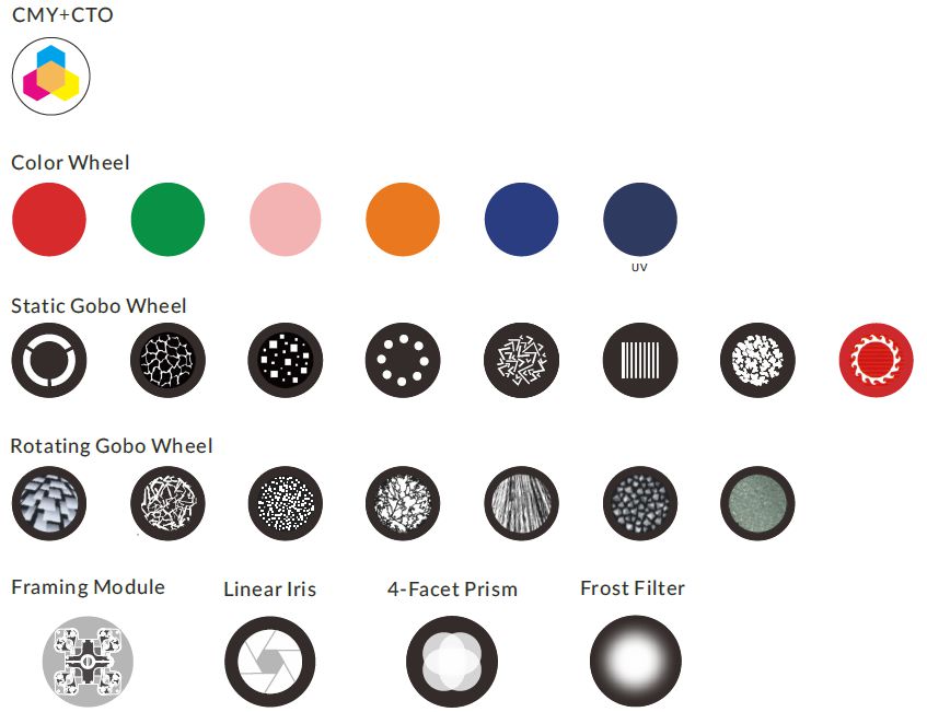 Linear CMY color mixing system provides rich color saturation and clear seamless color transition. All gobo wheels are made of high-definition color separation glass, can create various graphics together with color wheel. The linear CTO color temperature of the AECO 5 is between 2,700k and 6,000k.