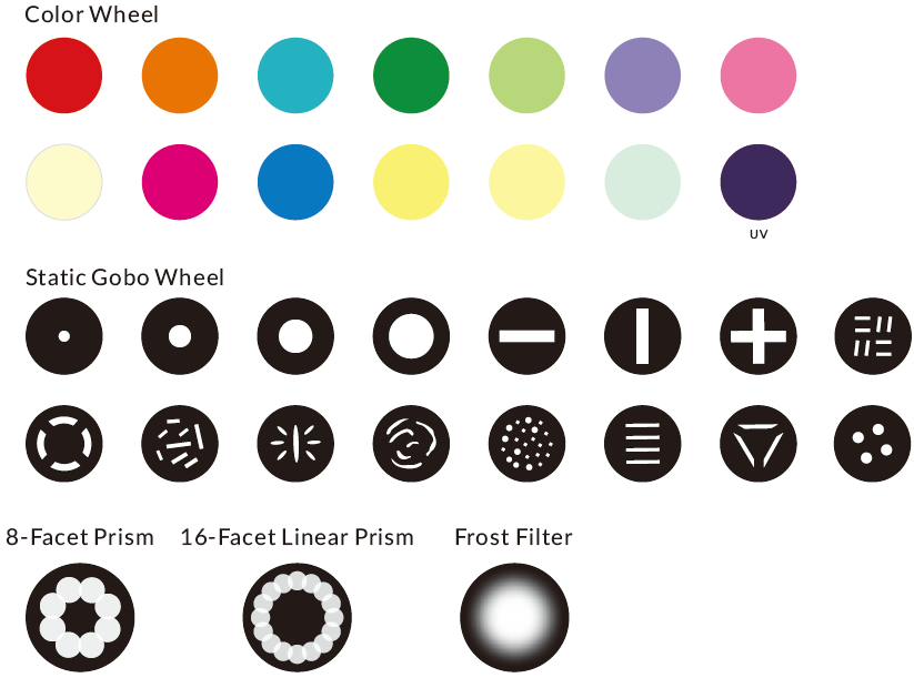 - Static gobo wheel: 1 static gobo wheel with 16 high-precision gobos, plus open Color wheel: 1 color wheel with 14 colors plus white, rainbow effect