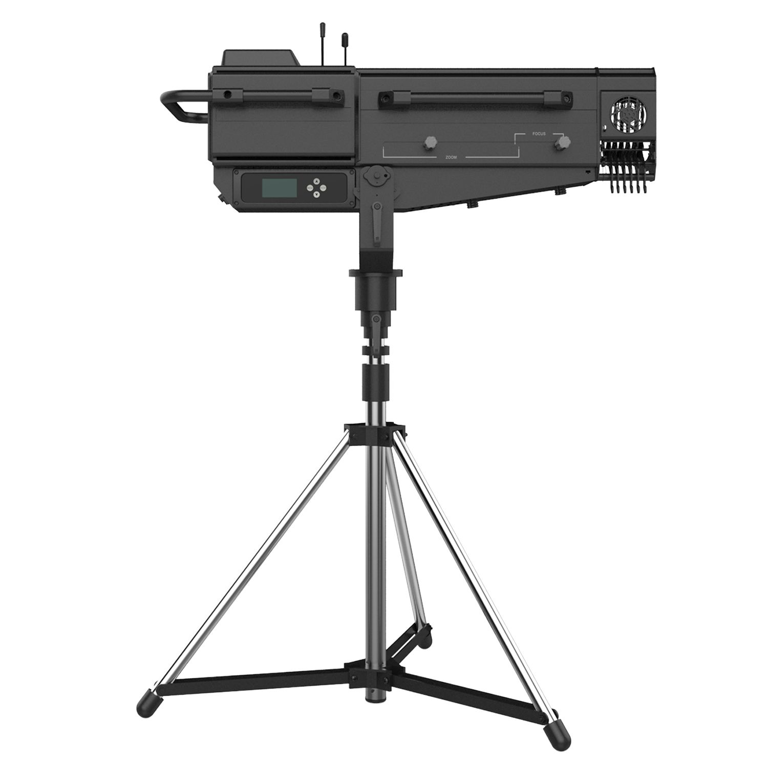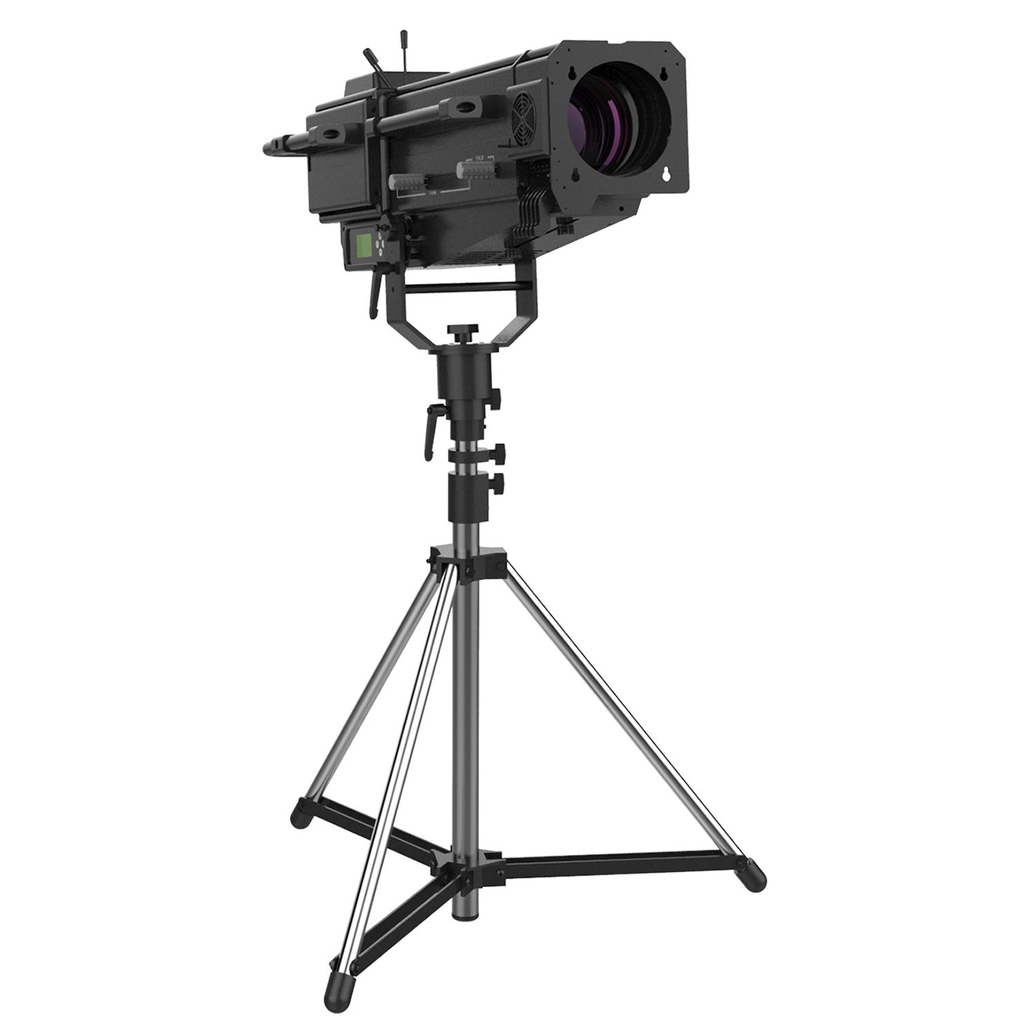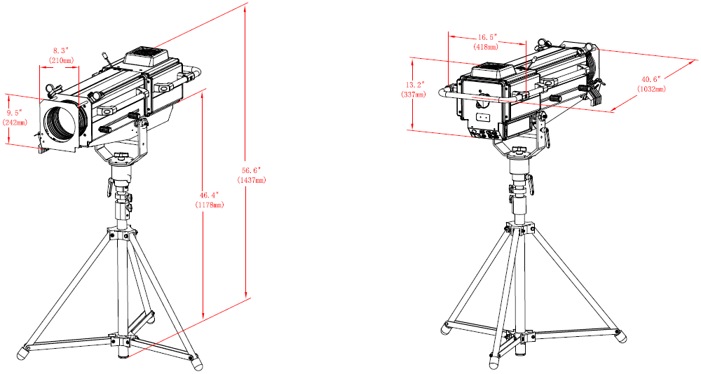 The ACME GLORY FOLLOWSPOT II Features an OSRAM Lok-it! 1000/PS Brilliant 1000W 6000K lamp, to project a crisp 6000K white light for exhibition and display applications, as well as a warm 2700K for stage performance. It has an adjustable iris range from 5% to 100%, a zoom ratio of 1:4 (5˚ to 20˚) and manual focus, plus a custom tripod which enables smooth pan and tilt movements. The GLORY FOLLOWSPOT II has a comfortable and stable feel for tracking performers. Not only can it project light with high CRI (>90), it also includes 7 different color temperature filters in the compact body, making a CCT range from 2700K to 5600K available by manual selection on the display, offering more possibilities for various applications and an excellent tracking effect. What’s more, a 5-slot manual boomerang is attached to the front of the unit for quiet color changing.