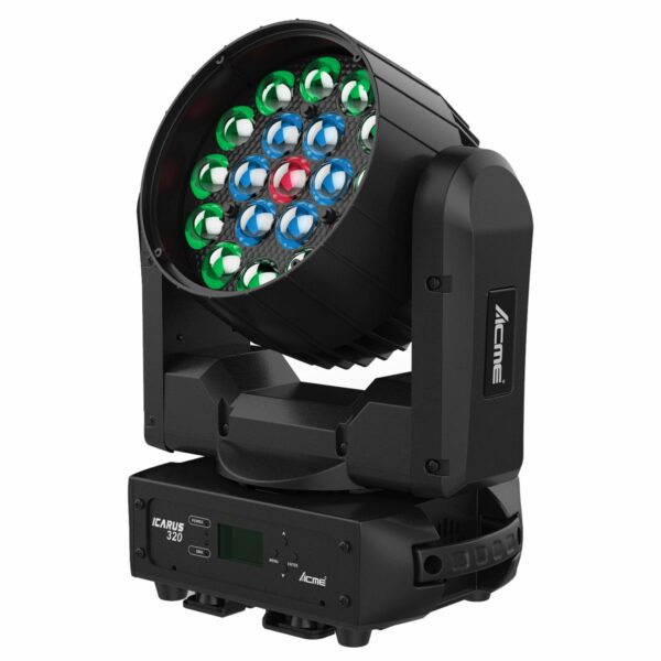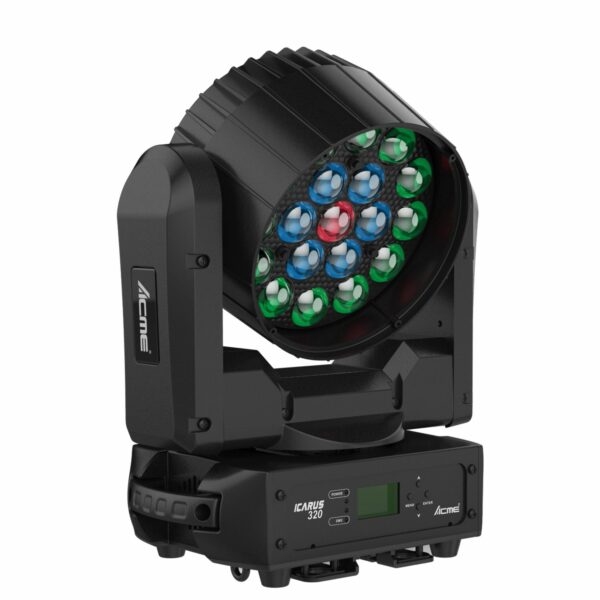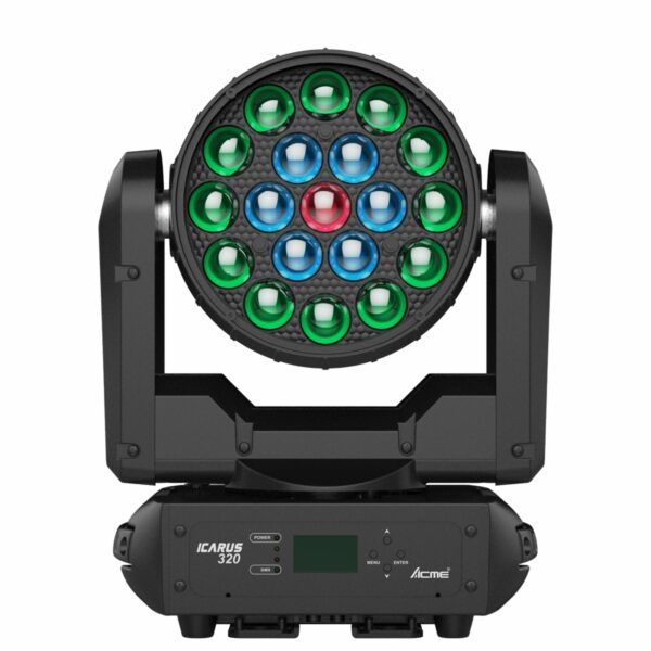 The ICARUS 320 has upgraded the light source from the PAGEANT 300Z II. It offers a washing effect by adding all the benefits of LED technology with lower energy consumption, longer lifespan, lighter weight and compact design. The ICARUS 320 is equipped with 19pcs 20W multicolor RGBW 4in1 LEDs that produce a vivid colors as well as excellent color mixing effect. It is also equipped with a motorized 1:6 zoom ratio from 10°-60° degree. Each ring of LED circle color can be controlled independently, this unique ring control not only allows you to create an endless ring chasing effect, but also to use each circle of LEDs ring as a graphic images that change dynamically in a circle. The 0-100% smooth dimming, flicker free management system and a reasonable output at 5,000lm should be confident for multi small to medium stage wash application.