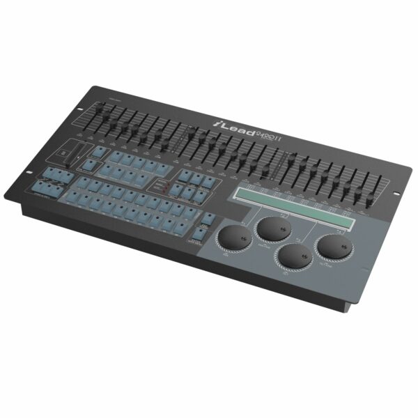 The iLead 2420 II is a powerful and professional DMX512 console, enabling you to program and Control20 DMX fixtures, each of up to 24 channels. Built-in are 10 movements, 20 presets, 60 banks of 20 scenes, 60 chases, 60 cues, 20 overrides and 20 centre position, for fast and easy show design. The Controlsurface Features 24 faders, 20 function buttons, four rotary wheels and an LCD display, enabling easy access to program, edit and operate – and get the best performance from your lighting fixtures.