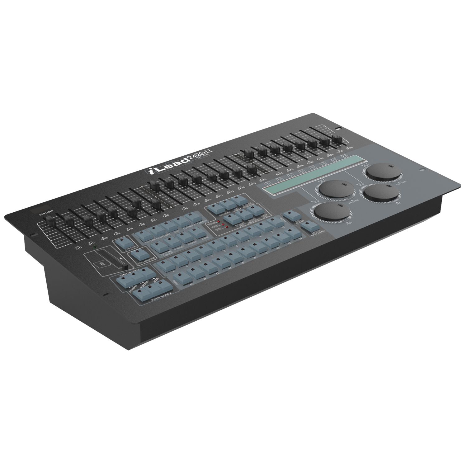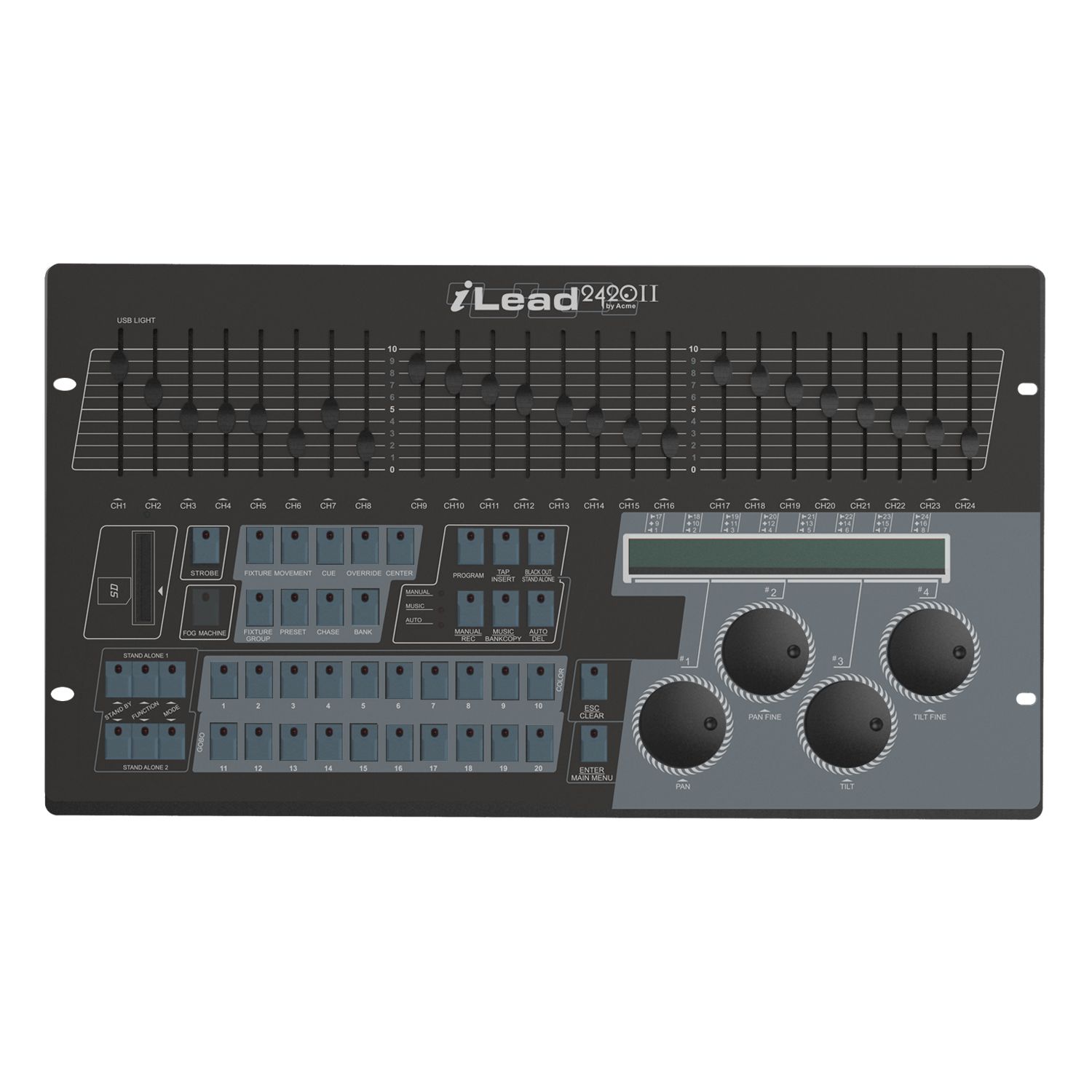 The iLead 2420 II is a powerful and professional DMX512 console, enabling you to program and Control20 DMX fixtures, each of up to 24 channels. Built-in are 10 movements, 20 presets, 60 banks of 20 scenes, 60 chases, 60 cues, 20 overrides and 20 centre position, for fast and easy show design. The Controlsurface Features 24 faders, 20 function buttons, four rotary wheels and an LCD display, enabling easy access to program, edit and operate – and get the best performance from your lighting fixtures.
