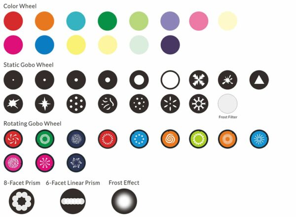 Other Features include a Color Wheel with 14 colors plus white, 1 rotating gobo wheel with 12 replaceable gobos plus open, and 1 static gobo wheel with 17 gobos plus open, delivering outstanding macro effects and bi-directional rainbow effect, as well as a variety of graphic effects.