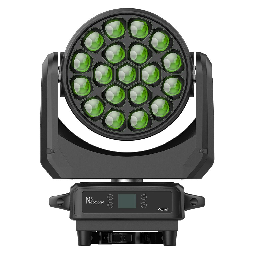 ACME NEOZONE, building on the historical ACME GLAMOUR series, delivering more punch and dynamic wash beam. Driven by 19, independently pixel controlled,40W RGBW LEDs, variable CTO from 2500K to 8000K, delivering over 9,000 lumens of full-on output to provides a gorgeous wash beam that stands out on any stage. With its wide zoom range from 4°to 50° it provides intense and well-defined mid-air beams as an exceptionally wide and even wash coverage, making it a perfect fixture for any application, even in outdoor stadium conditions. We have added more advanced correction of color uniformity technology which keeps NEOZONE at uniform color performance to solve the mixture of batch problems. Being exceptionally quiet moving with the new smooth step motors, and advanced cooling in house design,flicker-free adjustable management design for HD cameras, the fixture is ideal for live Stage, TV shows, art performing, etc.