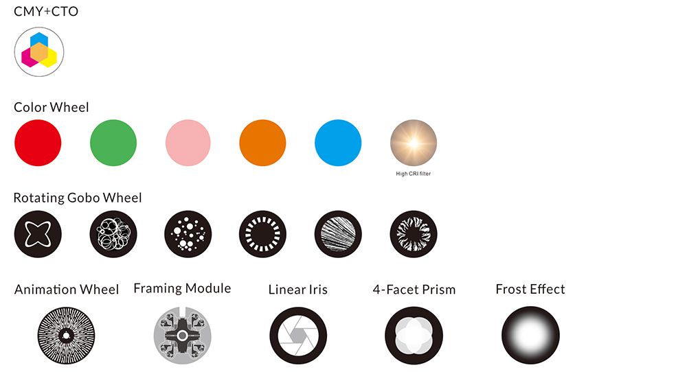 1x rotating gobo wheel with 6 gobos plus open; easy to replace