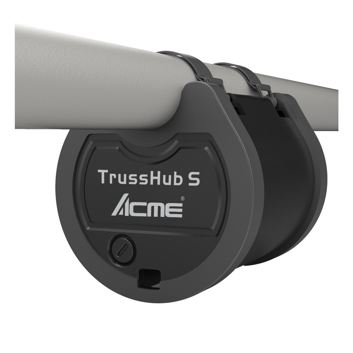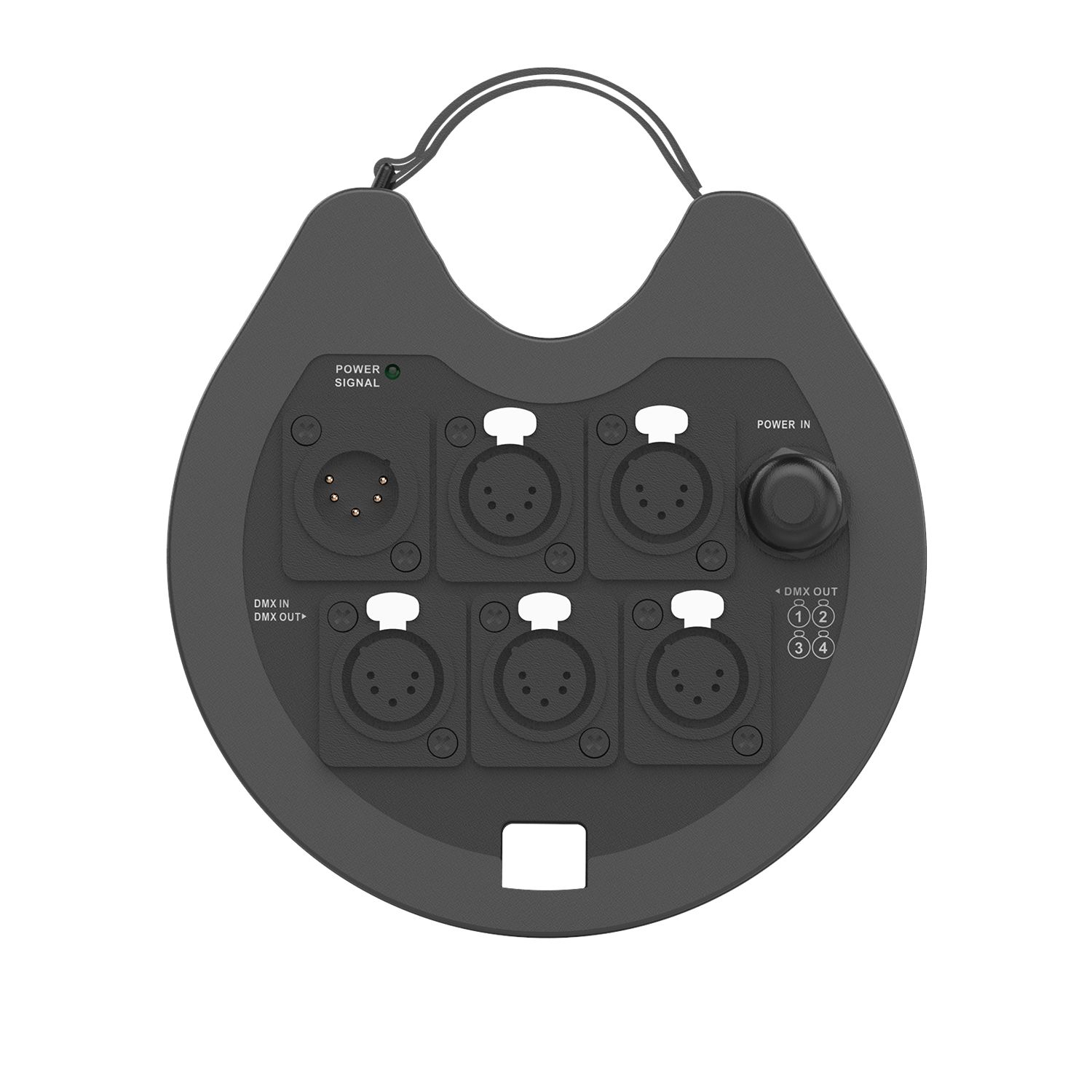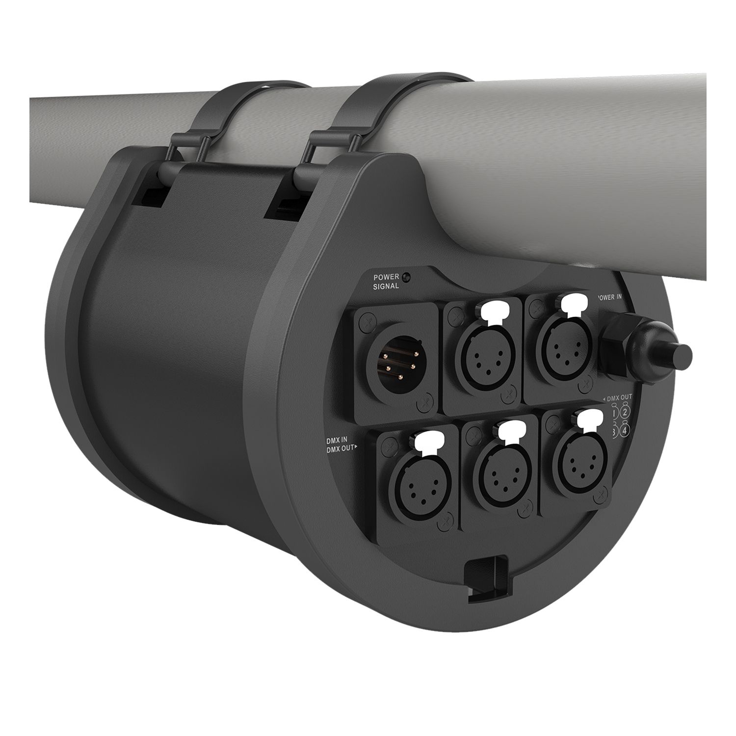The TRUSSHUB S (CA-RS14T) is a 4-way DMX-512 (RDM) signal amplifier and splitter, dedicated to DMX-512 signal amplification and splitting. Designed for connection of DMX receivers (moving heads, color changers, dimmers etc.), the unit is protected by shock-absorbing rubber edging on both sides. Available for 40mm, 50mm or 60mm diameter truss, it is suitable for applications in which the DMX-512 signal is weakened over long-distance transmission. The TRUSSHUB S, with its IP66 waterproof protection, works perfectly indoors or out, efficiently buffering and magnifying the DMX signal, ensuring the DMX data transmission is accurate and reliable.