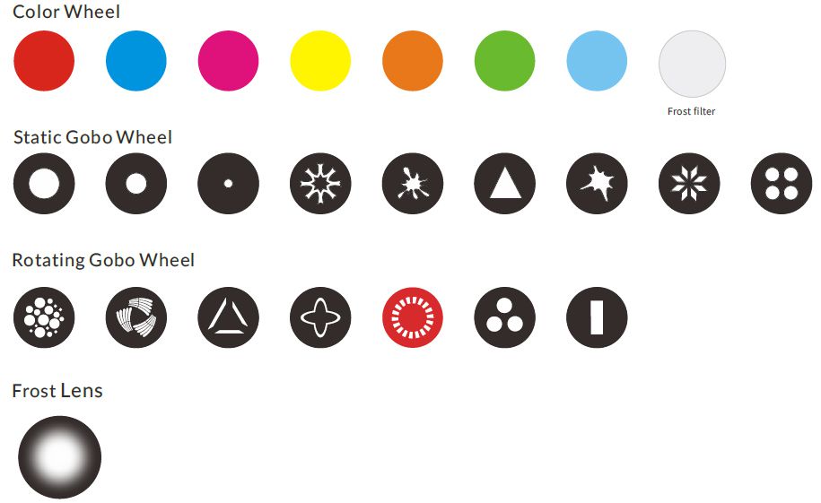 Static gobo Wheel: 1 static gobo wheel with 9 gobos plus open
