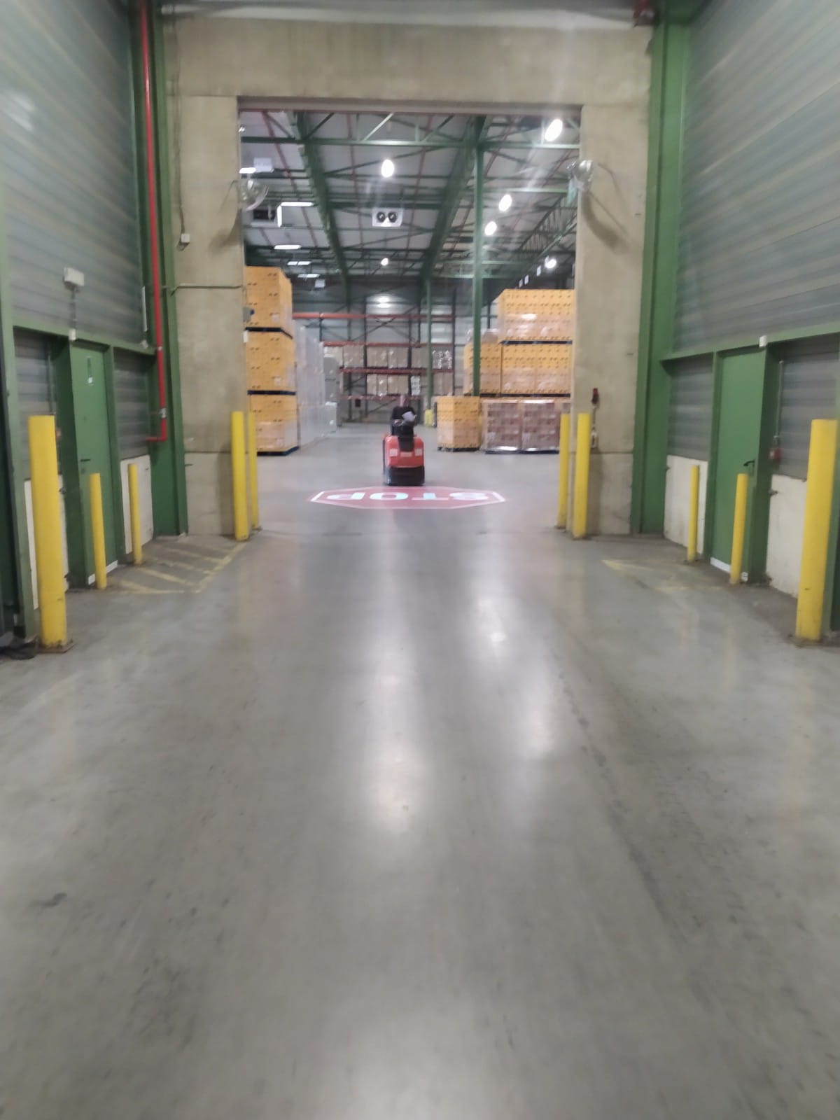 Op twee posities hebben zij een projector met bewegingsmelder opgehangen. Komt er een heftruck aan dan zal de projectie verschijnen zodat een ieder altijd geinformeerd is over een komend voertuig.
